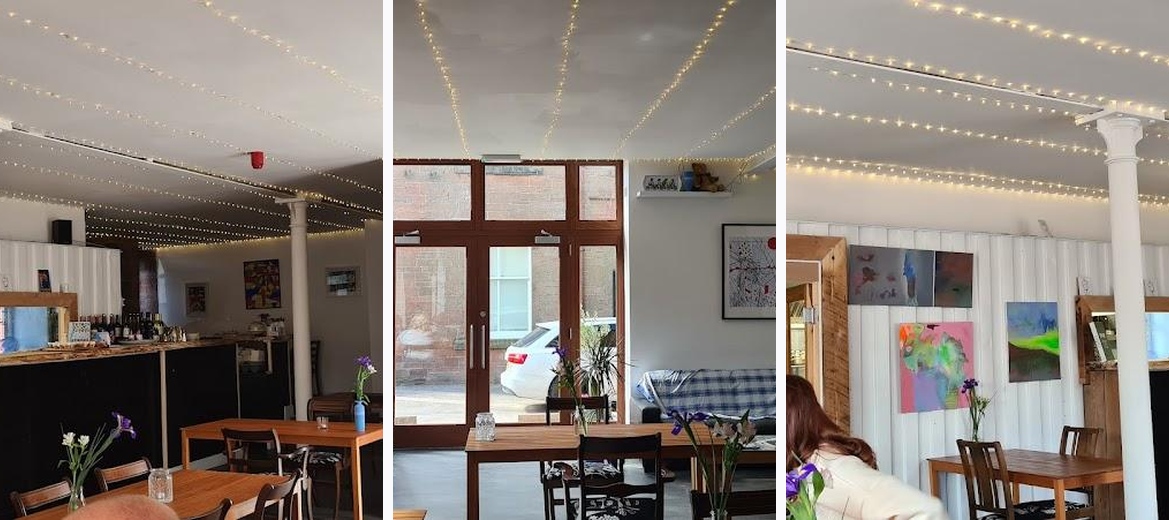 The ambiance is warm and inviting, enhanced by fairy lights and art on the walls. The quaint interior design and large windows create a charming atmosphere filled with natural light.